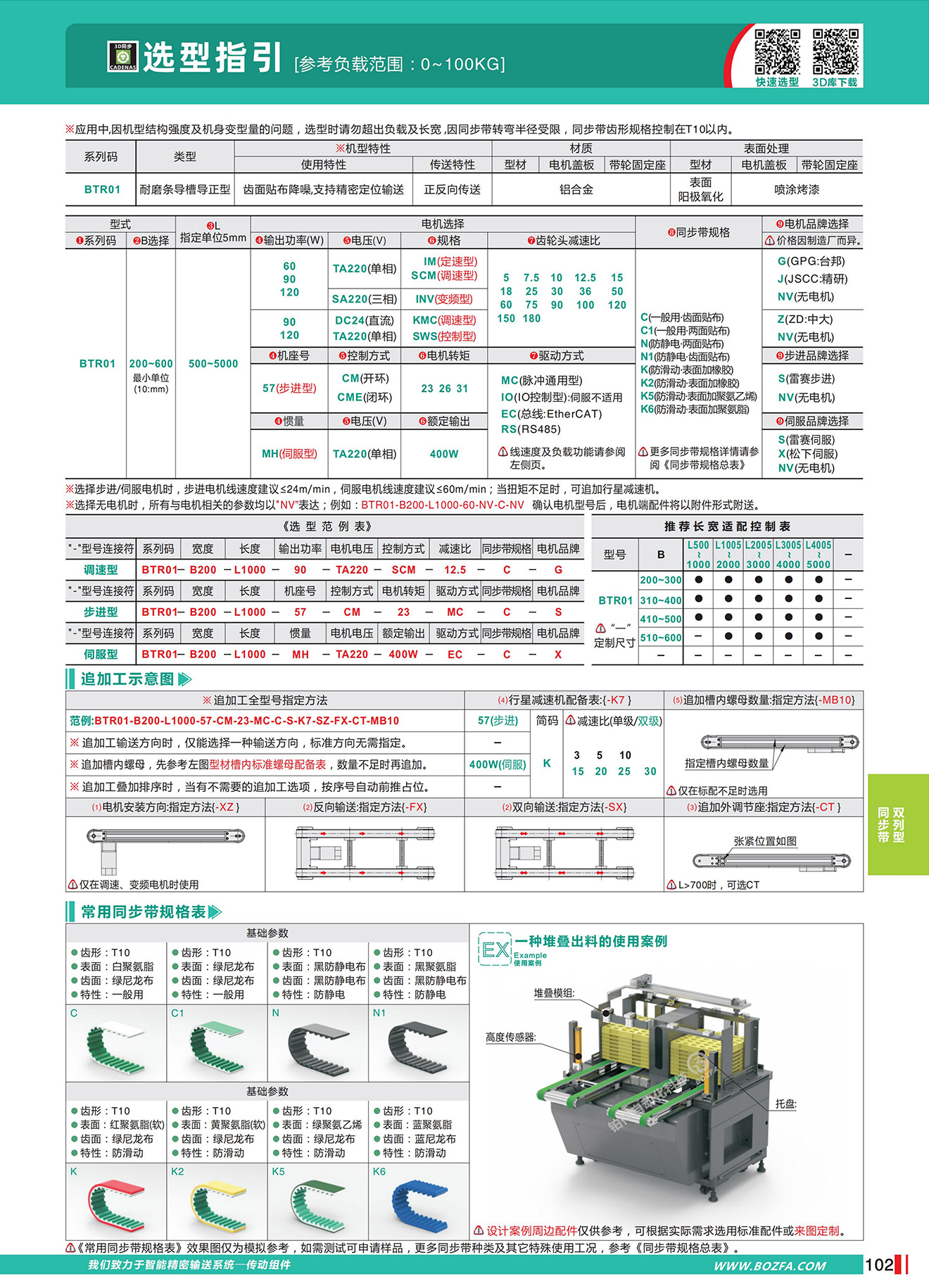 • BTR01:正反向传送,耐磨条导槽导正型,齿面贴布降噪,支持精密定位输送