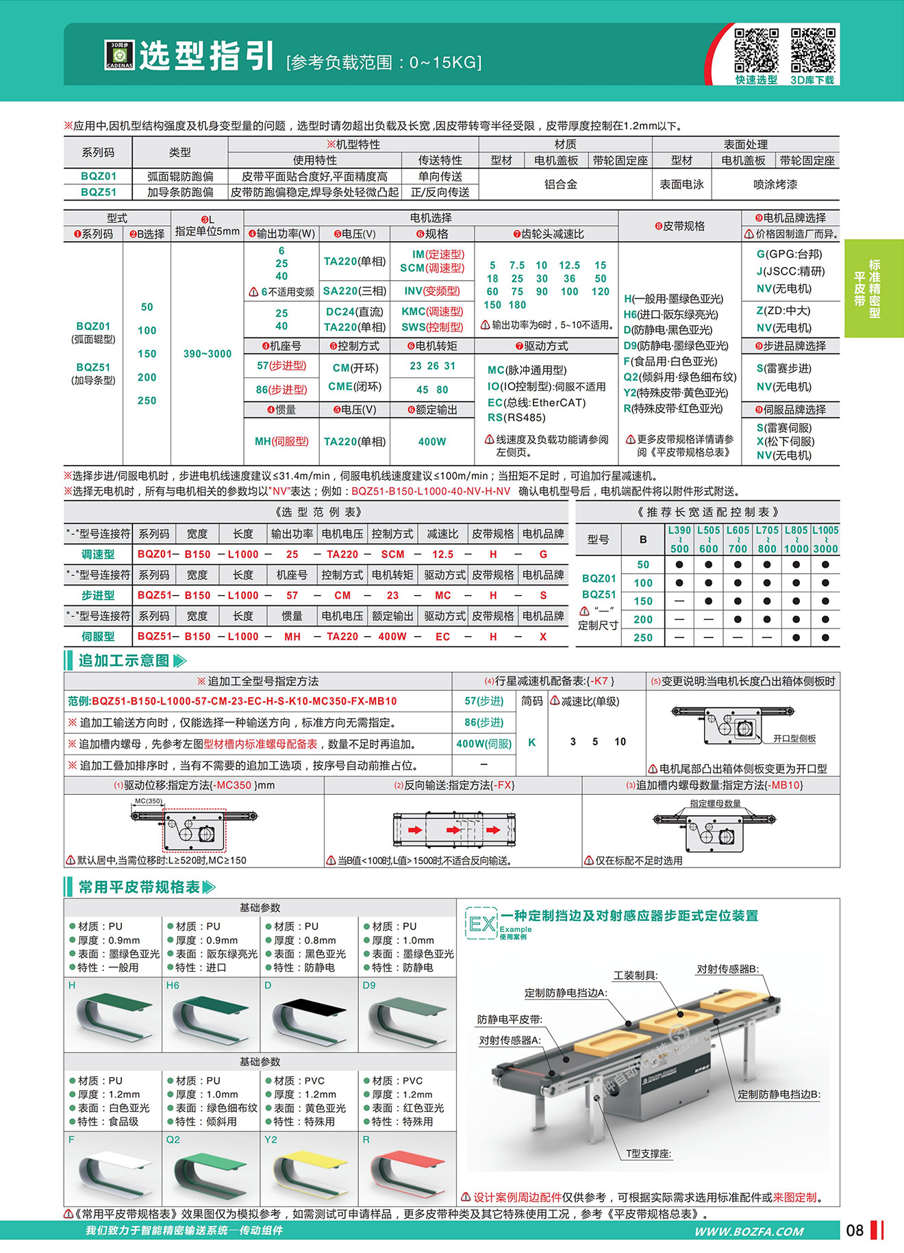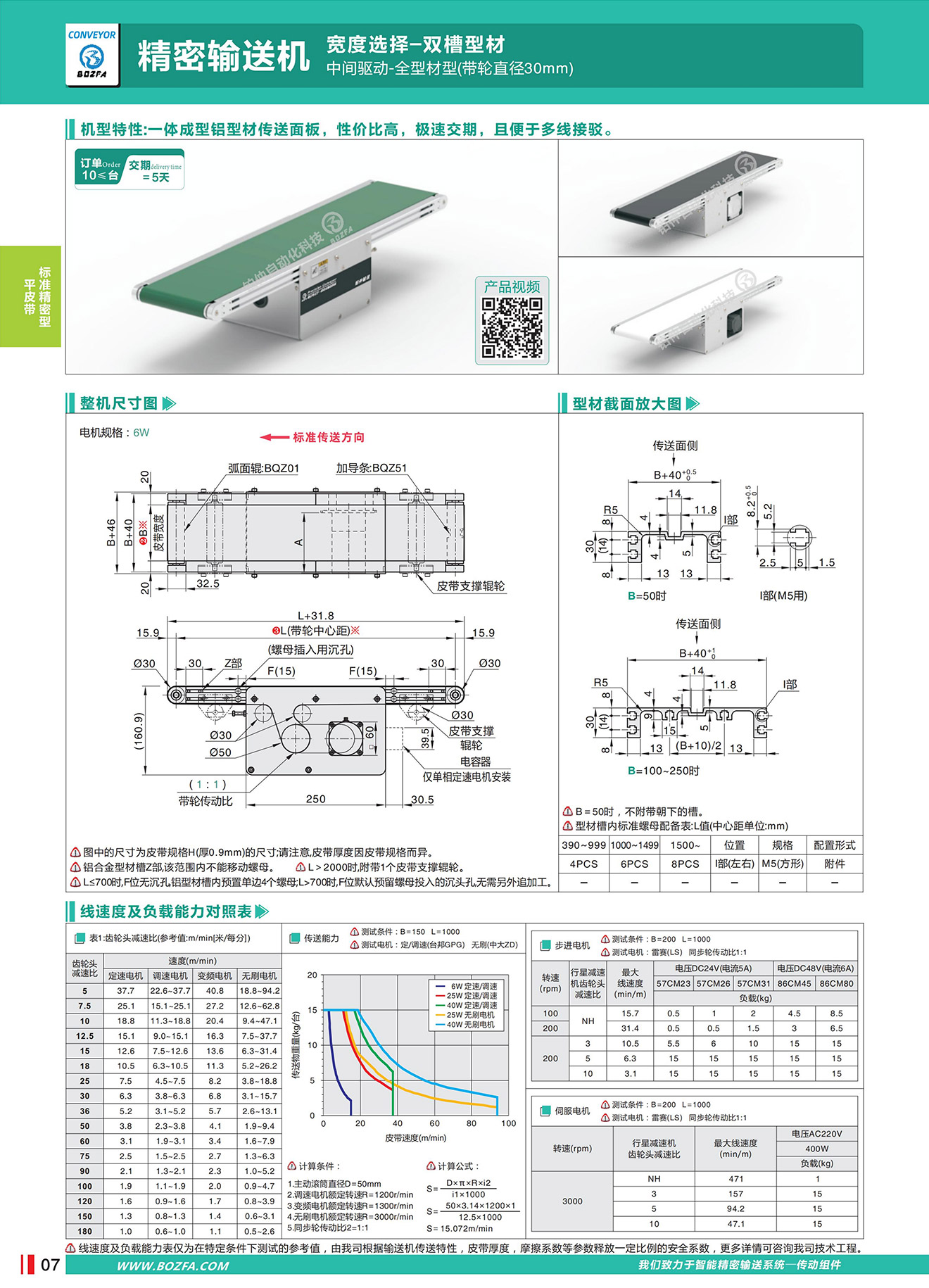 • BQZ01:单向传送,弧面辊防跑偏,皮带平面贴合度好,平面精度高