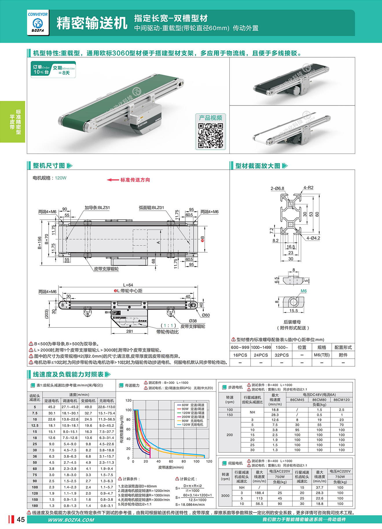 • 机型特性:重载型,通用欧标3060型材便于搭建型材支架,多应用于物流线,且便于多线接驳。